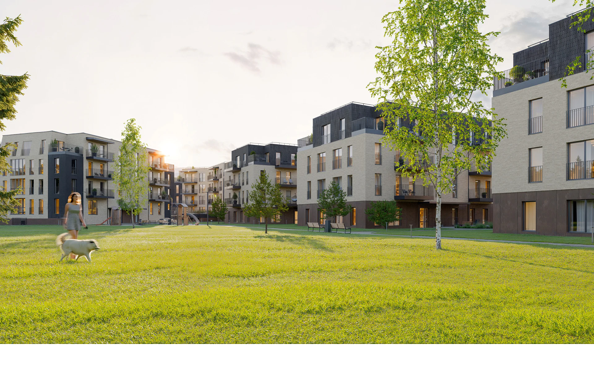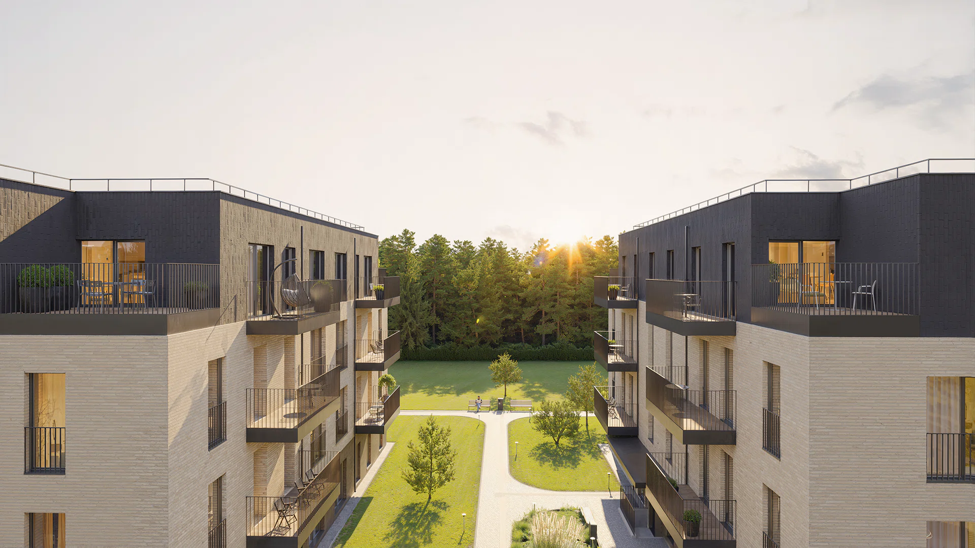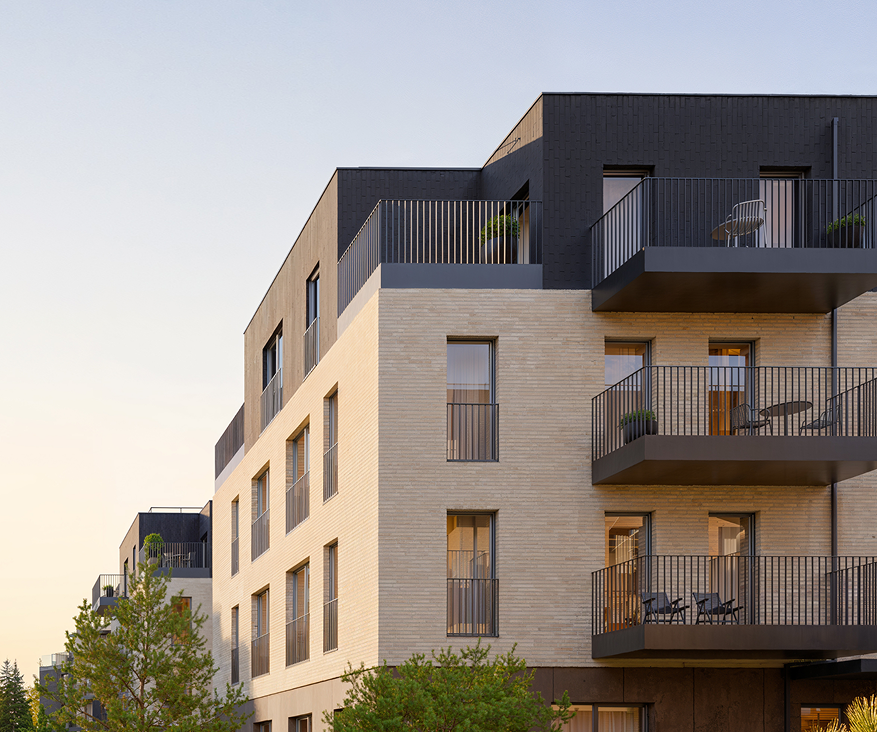 Pastatų apdaila derina ilgaamžiškumą ir estetiką: pirmieji aukštai bus dengiami didelio formato plytelėmis su subtiliu bronzos atspalviu, o viršutiniai – klinkerio plytelėmis, suteikiančiomis tekstūros ir solidumo.