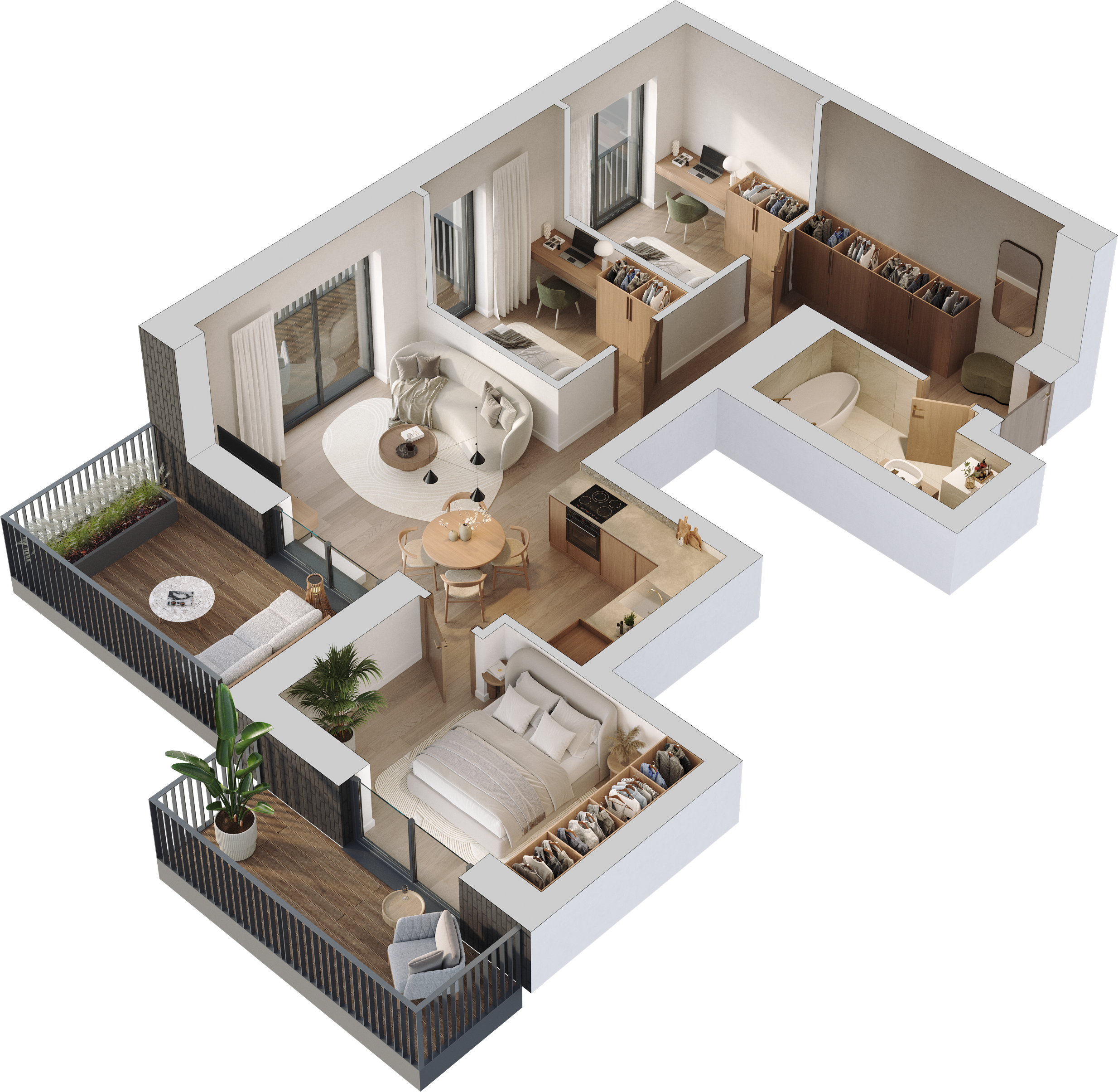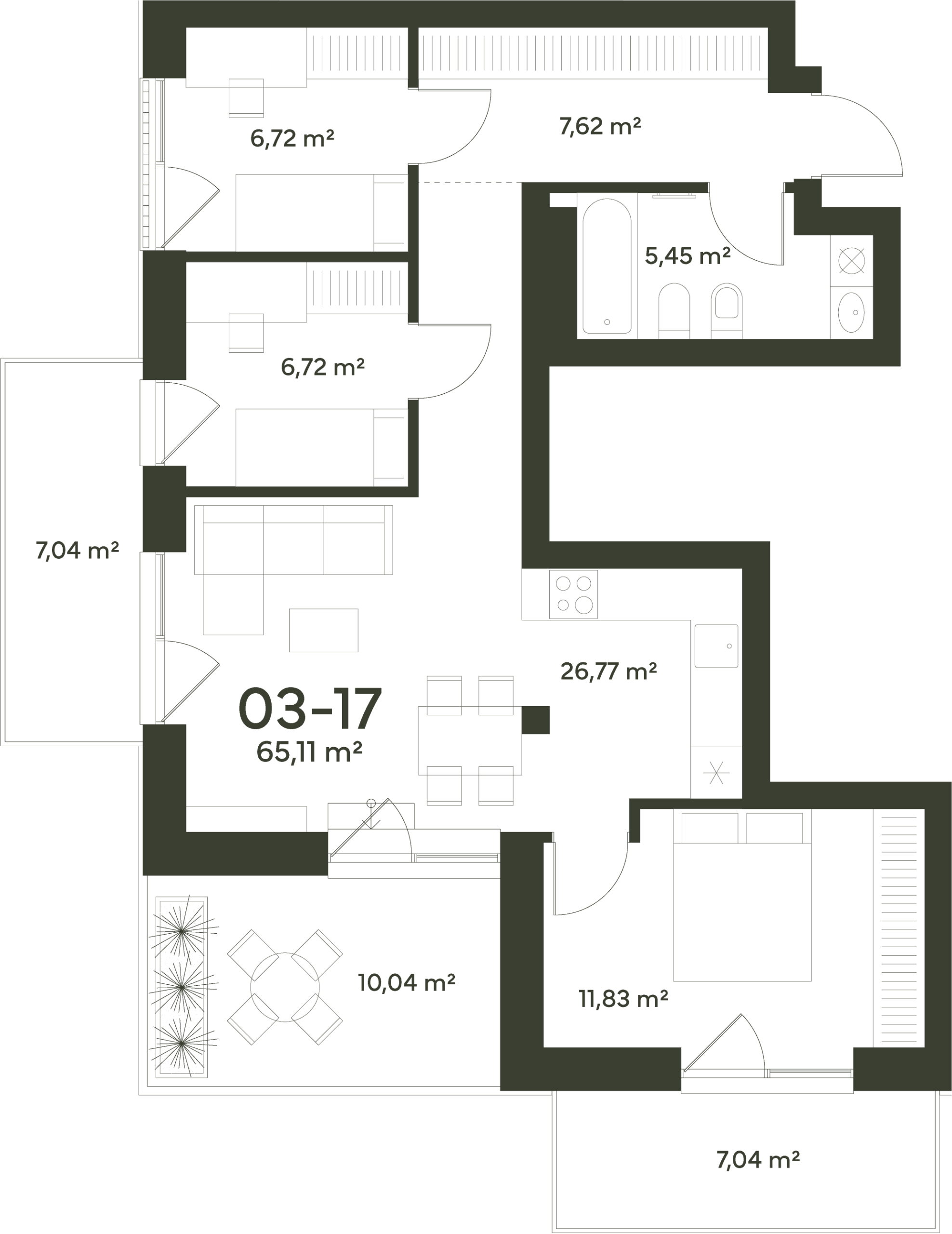 Panoraminis vaizdas, 2 Balkonai (7,04 m²), Terasa (10,04 m²)